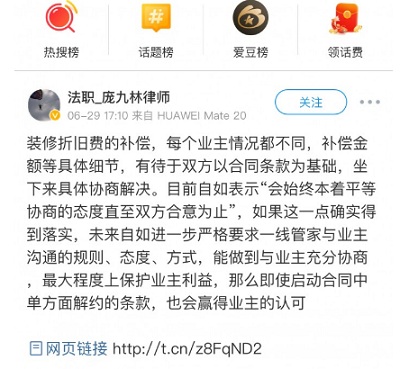 “裝修折舊費的補償,每個業(yè)主情況都不同,補償金額等具體細(xì)節(jié),有待于雙方以合同條款為基礎(chǔ),坐下來具體協(xié)商解決。目前自如表示‘會始終本著平等協(xié)商的態(tài)度直至雙方合意為止,如果這一點確實得到落實,未來自如進(jìn)一步嚴(yán)格要求一線管家與業(yè)主溝通的規(guī)則、態(tài)度、方式,能做到與業(yè)主充分協(xié)商,最大程度上保護(hù)業(yè)主利益,那么即使啟動合同中單方面解約的條款,也會贏得業(yè)主的認(rèn)可!饼嬀帕致蓭熣f。