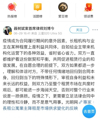 “疫情成為合同履行期間的意外因素,長租機構(gòu)與業(yè)主在某種程度上是利益共同體,自如給業(yè)主帶來機構(gòu)化運營下的各種效益,省時省心省力。雙方一直都維護(hù)著這份默契和平衡,共同促進(jìn)租賃行業(yè)的和諧發(fā)展。在自愿合理的前提下,雙方如果都退一步,理解和體諒對方,不帶任何情緒地回歸到合同本身,回歸到當(dāng)下的特殊情形下,審視自身利益和未來長遠(yuǎn)的權(quán)益,則雙方乃至整個租賃市場在共度時艱后,都可能進(jìn)一步海闊天空,否則對整個行業(yè)來說是一損俱損。疫情之下,更需要立足法律合同中的理性和冷靜,而不是意氣用事!眲⒉┙衤蓭煼Q。