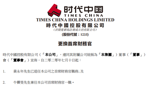 時代中國12日發(fā)布公告,更換首席財務(wù)官。公司指出,自2020年7月10日起,黃永年退任本公司之首席財務(wù)官職務(wù),牛霽旻先生兼任本公司首席財務(wù)官一職。