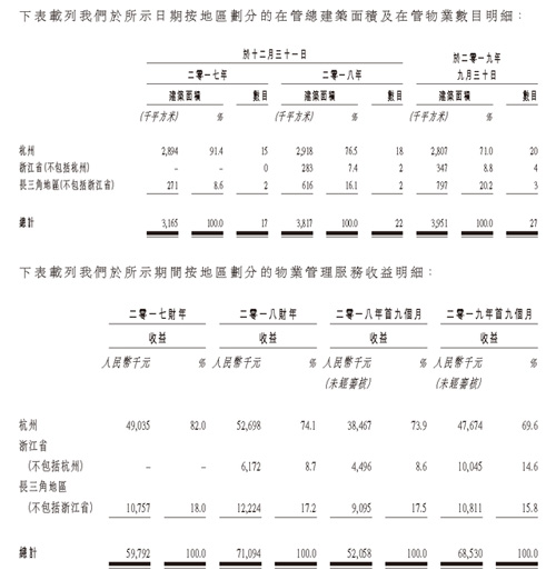 在2017年-2019年9月30日,宋都服務(wù)在杭州市的在管面積占比分別為91.4%、76.5%、71.0%,營收占比分別為82.0%、74.1%、69.6%。根據(jù)宋都服務(wù)招股說明書,其正逐步加大力度將服務(wù)范圍擴(kuò)展到長三角地區(qū)的其他城市。