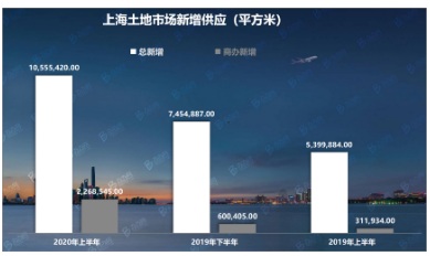 據(jù)辦辦網(wǎng)數(shù)據(jù)研究中心統(tǒng)計,2020年上半年上海土地市場新增經(jīng)營性用地掛牌供應(yīng)201宗,合計出讓面積10,555,420平方米。其中辦公用地為28宗,出讓面積總數(shù)為2,268,545平方米,占全部掛牌面積的21.49%,環(huán)比2019年下半年增長277.84%,同比2019年上半年增長627.25%。