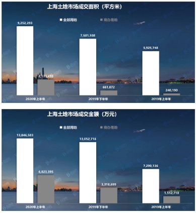 而在成交方面,據(jù)辦辦網(wǎng)數(shù)據(jù)研究中心統(tǒng)計,2020年上半年,上海土地市場共成交168宗土地,成交總面積為9,252,293平方米,環(huán)比去年下半年增長22.04%,同比去年上半年增長56.14%;成交總金額為13,846,503萬元,環(huán)比增長6.08%,同比增長89.93%。
