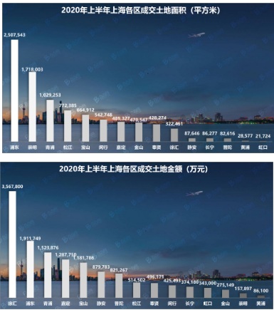 在各個區(qū)域中,浦東新區(qū)42幅地塊總計成交近251萬平方米成為上半年成交面積最大的區(qū)域,而徐匯區(qū)以2幅地塊總計成交近357億元成為上半年成交金額最多的區(qū)域。