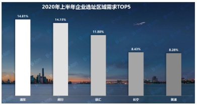 根據(jù)辦辦網(wǎng)數(shù)據(jù)統(tǒng)計,2020年上半年上海市辦公租賃市場中,浦東依然是企業(yè)辦公選址的首選區(qū)域,企業(yè)需求數(shù)量占整個需求市場的14.81%,占比幅度環(huán)比去年下半年略有下滑。排名前五的頭部區(qū)域中僅有閔行和黃浦的區(qū)域需求占比呈現(xiàn)增長,五大頭部區(qū)域的企業(yè)需求量占整個市場的57.48%。