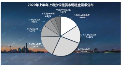 在2020年上半年的辦公租賃市場中,租金在3元/㎡·天以下的辦公項目成為最受關(guān)注的目標,需求占比達到57.01%,此租金段的占比需求相比2019年上半年略有下滑。浦東、閔行和徐匯是這個租金段最受關(guān)注的區(qū)域。而8元/㎡·天以上的高端租金需求相比2019年上半年則有一定幅度增長,需求占比達到8.94%,能承受高昂租金的客戶更青睞把尋址目標放在長寧、徐匯和浦東。