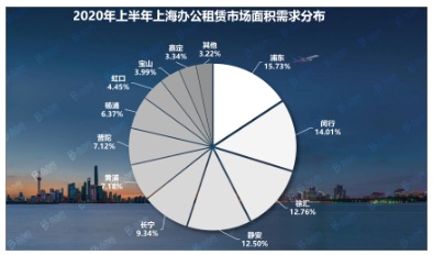 在區(qū)域分布方面,浦東、閔行、徐匯、靜安和長寧是上半年需求面積最多的區(qū)域,5個區(qū)合計需求辦公面積占整個市場的64.33%。