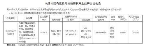 地塊出讓公告顯示,該地塊掛牌編號(hào)[2020]長(zhǎng)沙市051號(hào),為岳麓區(qū)梅溪湖國(guó)際新城一期,東臨肖龍路、南臨梧桐路、西臨賞月路、北臨梅溪湖中軸景觀線(L05-B521、L05-B522地塊),地塊出讓面積101648.16平方米,規(guī)劃用途為商業(yè)和住宅,該地塊起始價(jià)格為324857萬(wàn)元,競(jìng)買(mǎi)保證金162428萬(wàn)元,地塊樓面起始價(jià)為5300元/平方米。按照計(jì)劃,該地塊將于7月29日正式出讓。
