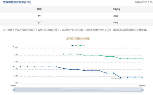 [提要]7月20日,7月LPR利率報價出爐:1年期利率報3.85%,5年期以上利率報4.65%。