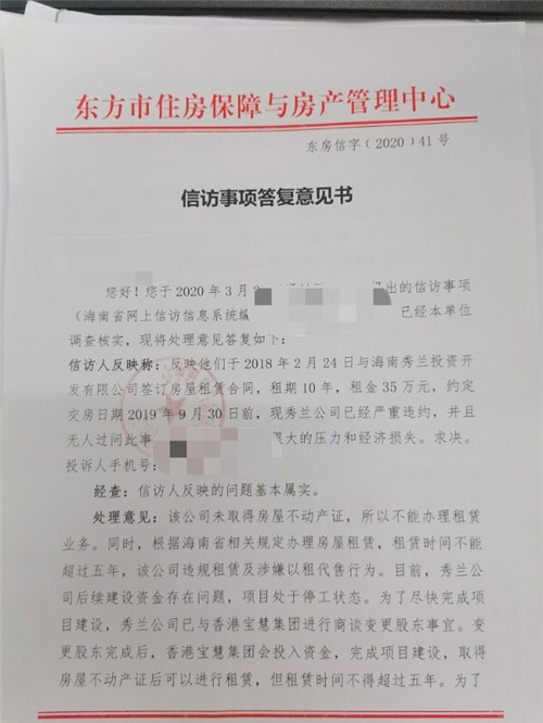 海南東方市住房保障與房產(chǎn)管理中心則向業(yè)主們回復:“該公司未取得房屋不動產(chǎn)證,所以不能辦理租賃業(yè)務。同時根據(jù)海南省相關規(guī)定辦理房屋租賃,租賃時間不能超過5年,該公司違規(guī)租賃及涉嫌以租代售行為!