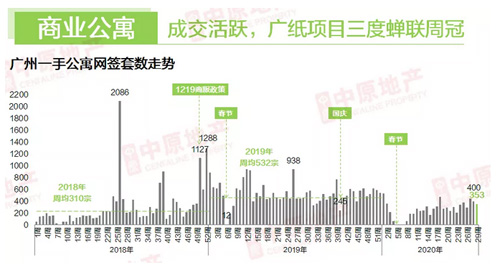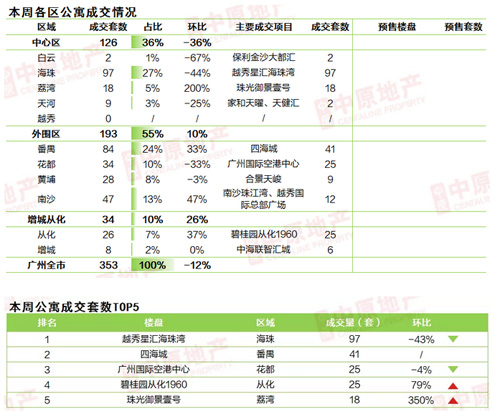 增城區(qū)成交與上上周持平,僅8套公寓交易。從化區(qū)因碧桂園從化1960的活躍成交,銷量回升至26套。