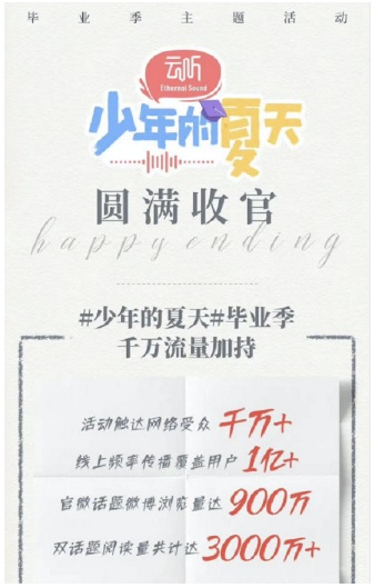 日前,中央廣播電視總臺音頻客戶端云聽發(fā)布了“少年的夏天”活動數(shù)據(jù)。數(shù)據(jù)顯示,相關(guān)廣播內(nèi)容覆蓋用戶超過1億人次,僅微博主話題就有超過3千萬人次參與。同時,在活動期間,云聽還聯(lián)合居住服務領(lǐng)導品牌自如共同發(fā)起#畢業(yè),自如地說出心里話#用戶故事征集活動,并吸引近500萬網(wǎng)友圍觀。