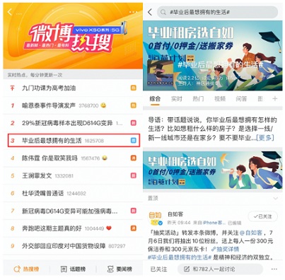 據(jù)悉,該征集活動屬于自如畢業(yè)生租房專享優(yōu)惠活動“海燕計劃”,并推出由果味VC樂隊(The Super VC)演唱的“少年的夏天”同名主題曲《少年的夏天》、發(fā)起#畢業(yè)后最想擁有的生活#微博熱門話題討論等。其中,后者連續(xù)兩次登榜微博熱搜,累計話題參與量達到2.2億人次,最高實現(xiàn)熱搜榜第三名,成為網(wǎng)友關(guān)注話題。