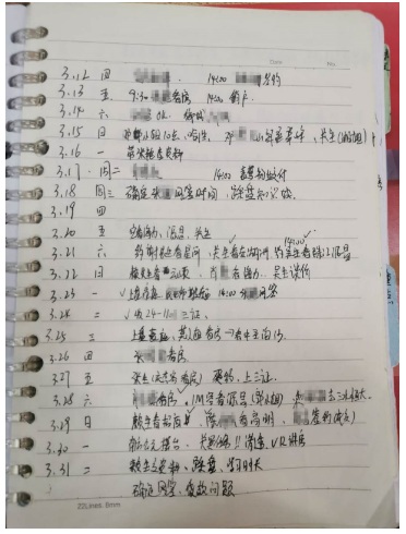 在一本厚厚的筆記本上,編者看到朱玉嫣詳細(xì)記錄著每天的行程安排和客戶跟進(jìn)情況!拔沂且粋不喜歡拖沓的人,每天要帶看哪位客戶,踩什么樓盤,我都會提前記在本子上,這樣做事會更有條理和效率!彼f。