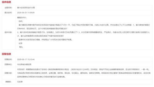 有市民向《市長信箱》投訴說,嚴控房價之下,長沙富興時代御城項目去年在政府部門備案價格16000元/平方米沒有通過,為何今年報19000元/平方米反而通過了?對此,長沙市住建局回復稱,各級政府價格主管部門是商品房明碼標價的管理機關,依法對商品房經(jīng)營者執(zhí)行明碼標價和收費公示規(guī)定的情況進行監(jiān)督檢查。