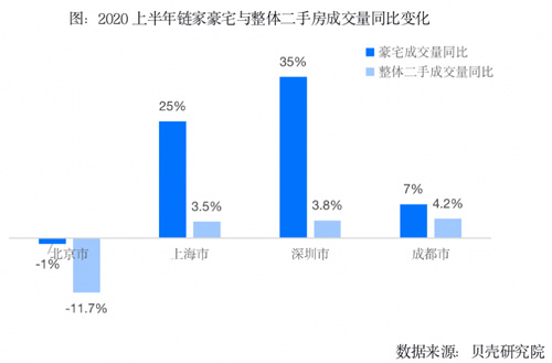 從整個上半年豪宅成交量數(shù)據(jù)看,區(qū)域市場分化顯著。市場基本面和經(jīng)濟(jì)活力較強(qiáng)的深圳、上海市場修復(fù)力度較大,上半年二手豪宅成交量分別同比增加35%、25%;成都上半年豪宅成交量同比增7%;而北京豪宅市場恢復(fù)相對較慢,上半年成交量僅基本恢復(fù)至去年水平,同比微降1%。