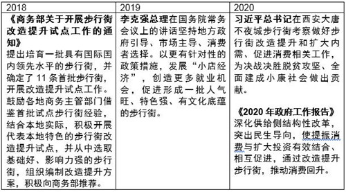 7月9日戴德梁行正式發(fā)布《2020商業(yè)步行街改造提升白皮書》。2020年5月22日,中國國務(wù)院總理李克強(qiáng)在十三屆全國人大三次會(huì)議上作《2020年國務(wù)院政府工作報(bào)告》,報(bào)告中涵蓋深化供給側(cè)結(jié)構(gòu)性改革,突出民生導(dǎo)向,使提振消費(fèi)與擴(kuò)大投資有效結(jié)合、相互促進(jìn),通過改造提升步行街,推動(dòng)消費(fèi)回升。