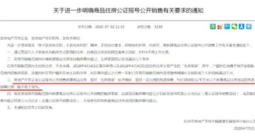 記者查閱了7月2日杭州市出臺(tái)的《關(guān)于進(jìn)一步明確商品住房公證搖號(hào)公開(kāi)銷(xiāo)售有關(guān)要求的通知》,其中第四條明確規(guī)定:“報(bào)名參加我市限購(gòu)范圍內(nèi)新建商品住房公正搖號(hào)公開(kāi)銷(xiāo)售的購(gòu)房家庭,自該項(xiàng)目購(gòu)房意向登記之日起至搖號(hào)結(jié)果公示當(dāng)日止,或至購(gòu)房意向登記結(jié)果公示當(dāng)日止,不得參加其他新建商品住房項(xiàng)目的購(gòu)房意向登記。”