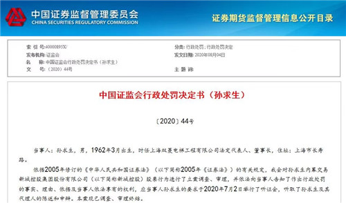 據(jù)證監(jiān)會(huì)官方網(wǎng)站消息,8月4日,證監(jiān)會(huì)發(fā)布〔2020〕44號(hào)行政處罰決定書(孫求生)。決定書顯示,與新城控股實(shí)際控制人王振華認(rèn)識(shí)十幾年的上海雙菱電梯工程有限公司法定代表人、董事長孫求生在獲知王振華猥褻兒童事件后突擊賣出持有的50000股新城控股股票。