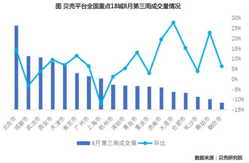 房訊網(wǎng)訊 據(jù)貝殼研究院數(shù)據(jù),8月第三周租賃市場成交量相比8月第二周環(huán)比上漲6.9%。分城市來看,8月全國重點(diǎn)18城租賃成交量普遍上漲,其中大連及廊坊市漲幅超過20%,合肥、青島、濟(jì)南、北京及南京市漲幅突破10%。