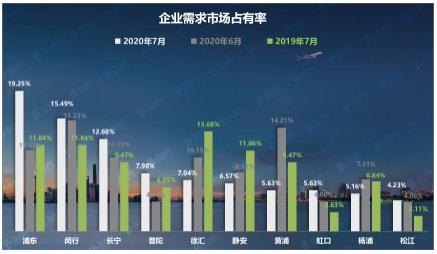 本次入榜的10個區(qū)域總共占據(jù)了整個上海辦公物業(yè)租賃市場89.67%的企業(yè)需求量,環(huán)比6月份再度有所增長。其中浦東的市場占有率最高,為19.25%。同時辦辦網(wǎng)數(shù)據(jù)研究中心發(fā)現(xiàn),環(huán)比6月份,各區(qū)的市場占有率出現(xiàn)不同變化,其中,浦東、閔行、長寧、普陀、虹口和松江有所增長,而其他4區(qū)則環(huán)比下滑。同比2019年7月份,浦東、閔行、長寧、普陀、虹口和松江的市場占有率有所增長,而其他4區(qū)則是同比下滑。