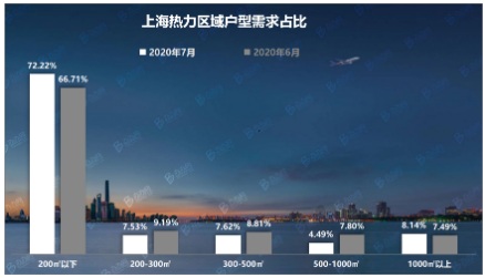 7月份熱門區(qū)域在租賃戶型面積的需求上,200平方米以下的小戶型需求占比為72.23%,環(huán)比6月份有所上升,浦東和閔行是這個戶型段最受關(guān)注的區(qū)域;而1000平方米以上的大戶型需求占比為8.14%,環(huán)比6月份同樣有所上升,浦東和徐匯則是這個戶型段最受關(guān)注的區(qū)域。