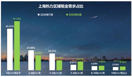 在2020年7月的辦公租賃市場中,租金在3元/㎡·天以下的辦公項目依舊是各熱門區(qū)域最受關(guān)注的目標(biāo),需求占比達(dá)到45.51%,環(huán)比6月份有所下滑,浦東和閔行是這個租金段最受關(guān)注的區(qū)域;而8元/㎡·天以上的高端辦公項目需求占比僅有8.13%,環(huán)比6月份同樣有所下滑,本月能承受高昂租金的客戶更青睞把尋址目標(biāo)放在黃浦和浦東。