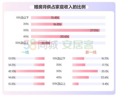 58安居客房產(chǎn)研究院調(diào)查顯示,超八成夫妻接受共同還貸。其中男方首付共同還貸的占比47.1%,雙方共同負(fù)擔(dān)的占比37.3%。對(duì)于婚房的月供,有近六成的調(diào)研人群表示月還款額在家庭整體收入的30%~40%左右,一線城市中月供占收入50%以上的占比15.3%,可見要想過上舒適型生活月供占比不宜太高。
