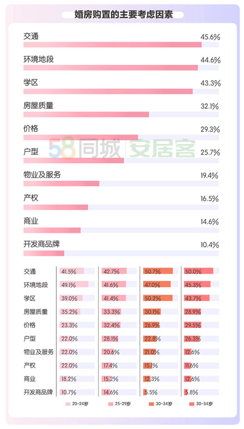 買房無小事,特別是對(duì)于新婚夫妻來說,房子買在哪里需要考量的因素也更復(fù)雜。58同城、安居客《2020年都市男女婚房置業(yè)報(bào)告》指出,新婚夫妻在選擇婚房時(shí),交通、環(huán)境地段、學(xué)區(qū)這三項(xiàng)是多數(shù)購房者優(yōu)先考慮的因素,占比均超過40%。相比“90后”,“80后”的購房者對(duì)于學(xué)區(qū)房的關(guān)注度相對(duì)更高;“90后”則更看重物業(yè)及服務(wù);“90后”中,超一成的人表示選擇婚房時(shí)也很看重開發(fā)商的品牌,考慮房屋質(zhì)量的人群占比也高于“80后”。