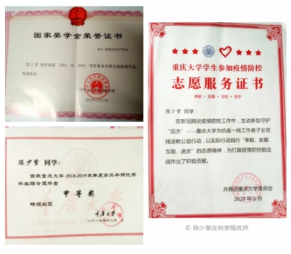 大學期間的陳少紫,學習成績依舊名列前茅,并積極投身到學校和班級的管理工作,在今年抗擊新冠疫情期間她主動請纓成為志愿者老師,目前是預備黨員的她,正為成為正式黨員而努力。
