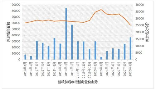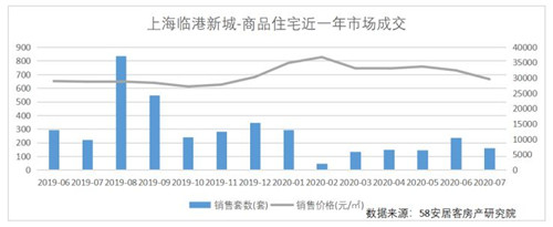 按照58安居客房產研究院數據,2019年8月受自貿區(qū)政策影響,臨港新房單月銷售套數達835套,而后銷量持續(xù)回落,至2020年2月達到最低點。到今年二季度,市場整體復蘇推動下銷量有了一定恢復,但今年最高單月銷量僅235套,依然低于去年8月-12月的最低銷量。同時新房價格也呈現沖高回落,今年7月均價跌破3萬元/平方米大關。