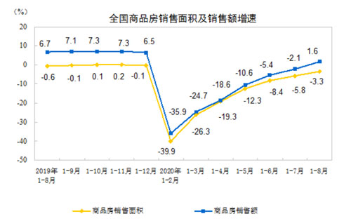 1—8月份,商品房銷售面積98486萬平方米,同比下降3.3%,降幅比1—7月份收窄2.5個百分點。其中,住宅銷售面積下降2.5%,辦公樓銷售面積下降19.5%,商業(yè)營業(yè)用房銷售面積下降17.0%。商品房銷售額96943億元,增長1.6%,1—7月份為下降2.1%。其中,住宅銷售額增長4.1%,辦公樓銷售額下降18.0%,商業(yè)營業(yè)用房銷售額下降19.9%。