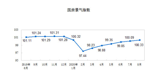 8月份,房地產(chǎn)開發(fā)景氣指數(shù)(簡稱“國房景氣指數(shù)”)為100.33,比7月份提高0.24點。