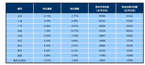 包括一線城市在內(nèi)的十大城市,也有4個(gè)出現(xiàn)環(huán)比下跌。降幅最大的為天津,環(huán)比下跌0.40%。重慶(主城區(qū))、北京緊隨其后,跌幅分別為0.21%和0.13%。廣州也有微跌,為0.06%。