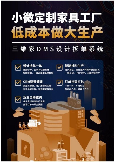 自2013年成立以來,三維家已逐步深入到家居產(chǎn)業(yè)的各個環(huán)節(jié),強化大數(shù)據(jù)和人工智能在家居各場景的深化應(yīng)用,并幫助超過1000家家居工廠完成前后端一體化布局。三維家為了深度賦能小微定制企業(yè)用戶,在產(chǎn)品矩陣上進行了縱向擴充,開發(fā)并推出了DMS設(shè)計拆單系統(tǒng),解決設(shè)計、生產(chǎn)、管理全流程的難題。