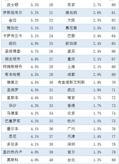 具體到城市來看,全球80個城市中租金收益率排名前十位為休斯頓、約翰內(nèi)斯堡、迪拜、費城、邁阿密、芝加哥、華盛頓、圣地亞哥、基輔、開普敦,分別從11.9%到7.0%;而排名后十位為布宜諾斯艾利斯、武漢、南京、香港、北京、杭州、廣州、天津、深圳、首爾、臺北,分別從1.9%到1.2%。排名前十位的租金收益率平均值為8.8%,是排名后十位的平均值1.7%的5.2倍。
