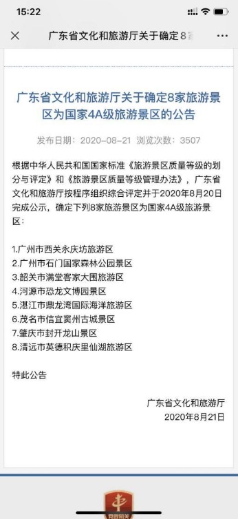 公告顯示,經綜合評定,確定廣州市西關永慶坊旅游區(qū)、廣州市石門國家森林公園景區(qū)、韶關市滿堂客家大圍旅游區(qū)、河源市恐龍文博園景區(qū)、湛江市鼎龍灣國際海洋旅游區(qū)、茂名市信宜竇州古城景區(qū)、肇慶市封開龍山景區(qū)、清遠市英德積慶里仙湖旅游區(qū)8家旅游景區(qū)為國家4A級旅游景區(qū)。
