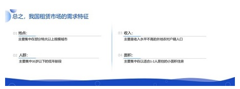 第一,在地點(diǎn)上,主要集中在大城市,城市的租賃需求是鄉(xiāng)鎮(zhèn)的一倍以上;第二,在人群上,租客主要以35歲以下的年輕人為主;第三,在收入層面,以外地戶籍人口、流動(dòng)性的人口為主,收入水平不高;最后,在租住面積上,以小面積住房為主。