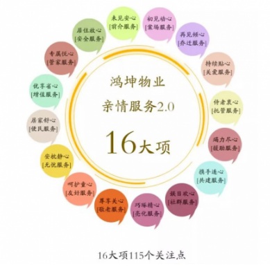 隨著市場和行業(yè)的不斷變化,品牌的重要性日益凸顯。鴻坤物業(yè)自成立17年以來,始終用謙卑的態(tài)度做好服務(wù),秉承“讓人們住的開心”的企業(yè)使命,用專業(yè)、主動、熱情、勤奮、用心和迅捷為業(yè)主打造“有家、有愛、有生活”的和美社區(qū)。鴻坤物業(yè)堅(jiān)持“客戶導(dǎo)向”,開創(chuàng)獨(dú)有的“親情服務(wù)體系”,在運(yùn)營的2年中,不斷改進(jìn),目前形成了“親情服務(wù)體系2.0”。通過精細(xì)化的物業(yè)管理,以客戶社區(qū)生活活動為線索,從場景、事件和管家三個維度切入模擬與業(yè)主每一個可能的接觸點(diǎn),提煉出16大項(xiàng),27個服務(wù)觸點(diǎn)、115個關(guān)注點(diǎn),并對每個觸點(diǎn)量化了重點(diǎn)服務(wù)標(biāo)注和常規(guī)服務(wù)標(biāo)準(zhǔn)。始終用心、用情服務(wù)。