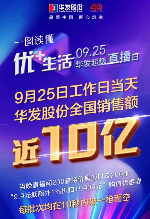 9月25日晚,華發(fā)股份抖音直播首秀——“華發(fā)超級直播日”拉開帷幕。這場由當(dāng)紅明星、華發(fā)股份高管及普通員工跨界合作的超級“帶貨”直播活動,累計觀看量達(dá)160余萬人次。直播當(dāng)晚約兩小時內(nèi),共分5批次推出的200套秒殺房源及200張“9.9元抵額外1%折扣+9999元”的購房優(yōu)惠券,每批次均在10秒內(nèi)被一搶而空。在話題的持續(xù)帶動下,25日工作日當(dāng)天,華發(fā)股份全國共實現(xiàn)銷售額近10億元。