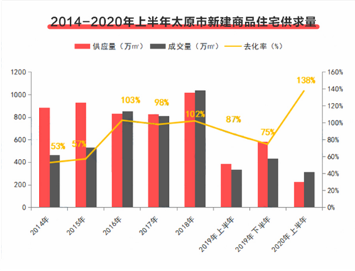 據(jù)樓查查統(tǒng)計數(shù)據(jù)顯示,2020年上半年太原市新建住宅出現(xiàn)了供應面積、成交面積、銷售套數(shù)均同比下降情況,但太原新建商品住宅去化率卻達到138%,環(huán)比上漲63個百分點;同比上漲51個百分點。新建商品住宅銷售均價11176元/平方米,環(huán)比下降1%;同比下降2%。