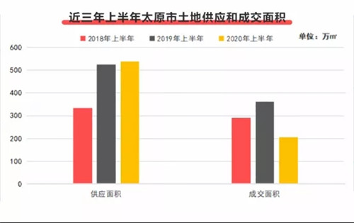 太原商品房銷售市場的低迷反映在土地市場是成交縮水。據(jù)樓查查統(tǒng)計數(shù)據(jù)顯示,近3年,太原市土地市場供應量呈現(xiàn)逐步增加態(tài)勢。2020年上半年太原市土地供應84宗,面積536.6萬平方米,較去年同期增長2%;但土地成交46宗,面積207萬平方米,較去年同期減少43%。
