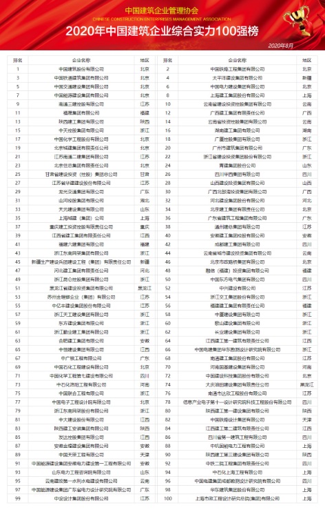 近日,2020年《中國建筑企業(yè)綜合實力100強》暨《中國50家最佳建筑承包商》排行榜發(fā)布,這是中國建筑企業(yè)管理協(xié)會對中國建筑業(yè)進行全面、科學(xué)、獨立的企業(yè)實力發(fā)展調(diào)查研究宣傳發(fā)布工作。通過對超過6000家利潤總額在8000萬元至420億元之間的中國大陸建筑施工、勘察設(shè)計、工程監(jiān)理等中國建筑企業(yè)進行了數(shù)據(jù)采集研究,基于對財務(wù)分析、行業(yè)分析、市場占有率分析確定候選企業(yè),邀請100位企業(yè)高管、學(xué)者及官員對經(jīng)資格審核符合要求的企業(yè)進行評選,比照國際上通行的做法,根據(jù)營業(yè)收入、資產(chǎn)總額、利潤總額、資信等級、社會貢獻、業(yè)主滿意度等指標(biāo)對候選企業(yè)進行綜合評分排序,并對部分候選企業(yè)進行實地拜訪,從中遴選出100家中國建筑企業(yè)綜合實力100強企業(yè)及50家中國50家最佳建筑承包商企業(yè)。在此基礎(chǔ)上通過與世界500強企業(yè)進行綜合對比分析,進而有針對性地提出促進企業(yè)做強做大做久的策略建議,在全國范圍內(nèi)形成了巨大的社會影響力。