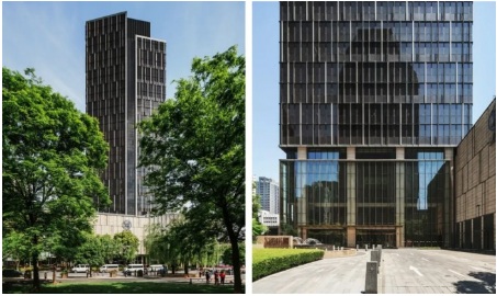 一期建筑采用經(jīng)典的ArtDeco風(fēng)格,而二期建筑由國(guó)際頂尖事務(wù)所KPF完成設(shè)計(jì),為現(xiàn)代風(fēng)格。建筑的玻璃幕則以石庫(kù)門(mén)窗扇為意向,變化出富有裝飾性的、靈動(dòng)活潑的豎向構(gòu)件。遠(yuǎn)遠(yuǎn)望去,企業(yè)天地5號(hào)的裙樓和塔樓形成了黑灰白三種層次的立面效果,但采用相似的豎向比例,因而顯得既整體也有細(xì)節(jié)。
