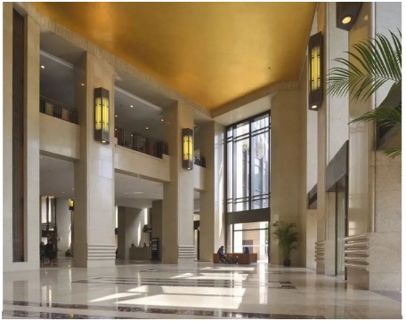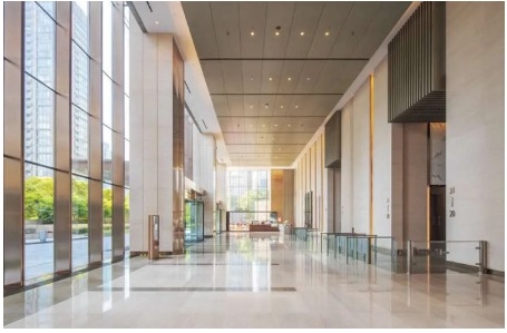 走進(jìn)入口大堂,便能發(fā)現(xiàn)室內(nèi)設(shè)計(jì)簡(jiǎn)潔大方,淡雅明快,別具一格,反映出了新時(shí)代的審美。辦公大堂區(qū)挑高達(dá)9米,視野開(kāi)闊無(wú)阻隔,通透的大面積的落地玻璃,又將室外的湖光綠樹(shù)引入眼簾。
