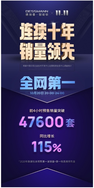 10月20日晚上8點,2021年雙十一大幕正式拉開,包括智能鎖在內(nèi)的各大品牌都開足馬力迎戰(zhàn)雙十一。其中德施曼超級主題“連續(xù)十年銷量領(lǐng)先”最為亮眼。根據(jù)官方數(shù)據(jù)顯示,截至21日0時,德施曼預(yù)售前4小時全網(wǎng)總訂單量破47600套,同比增長115%,蟬聯(lián)全網(wǎng)預(yù)售銷量第一,創(chuàng)下行業(yè)新紀(jì)錄。