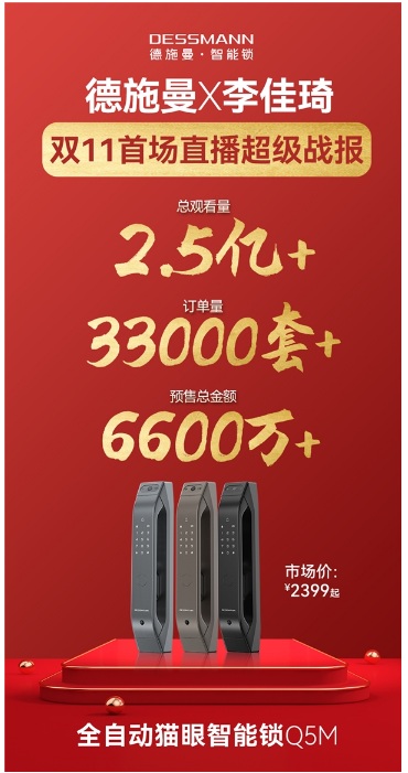 在單品表現(xiàn)方面,德施曼Q5M和李佳琦的種草熱度始終居高不下。10月20日,德施曼x李佳琦聯(lián)合推出的全自動貓眼智能鎖Q5M訂單量33000+套,預(yù)售總金額6600萬+,觀看人次2.5億+,創(chuàng)單品銷量歷史記錄。