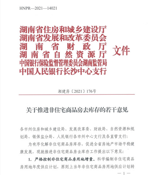 湖南省住建廳、省發(fā)改委、省財政廳、省自然資源廳、省銀保監(jiān)局、人民銀行長沙中心支行六部門近日聯(lián)合下發(fā)文件(湘建房[2021]176號,以下簡稱“文件”),就如何有序化解非住宅商品房庫存、推進非住宅商品房去庫存工作提出意見,力爭用3到5年時間,推動非住宅商品房庫存明顯下降。
