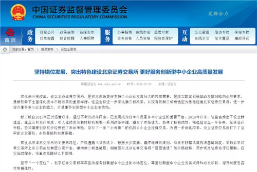 9月2日,國(guó)家主席習(xí)近平在2021年中國(guó)國(guó)際服務(wù)貿(mào)易交易會(huì)全球服務(wù)貿(mào)易峰會(huì)上發(fā)表視頻致辭時(shí)宣布:我們將繼續(xù)支持中小企業(yè)創(chuàng)新發(fā)展,深化新三板改革,設(shè)立北京證券交易所,打造服務(wù)創(chuàng)新型中小企業(yè)主陣地。