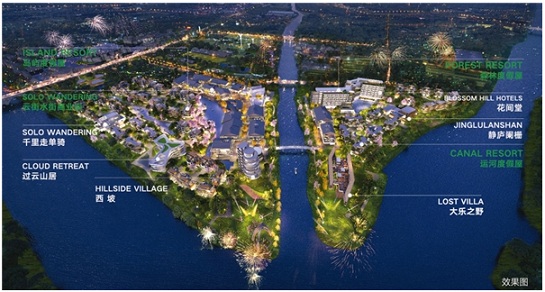從空中俯瞰,一艘探入運(yùn)河的船頭,在四河交匯處的三角地帶,規(guī)劃出一中心、兩街區(qū)、六大品牌民宿,以及森林、島嶼、運(yùn)河三大私人度假屋組團(tuán)。