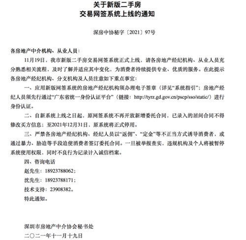 11月19日,深圳市房地產(chǎn)中介協(xié)會下發(fā)通知,深圳新版二手房交易網(wǎng)簽系統(tǒng)(以下簡稱新交易系統(tǒng))正式上線。自新交易系統(tǒng)上線之日起,原網(wǎng)簽系統(tǒng)不再開放新增委托合同,已錄入的居間合同不得修改買方信息。至2021年12月31日,原系統(tǒng)將正式停用。